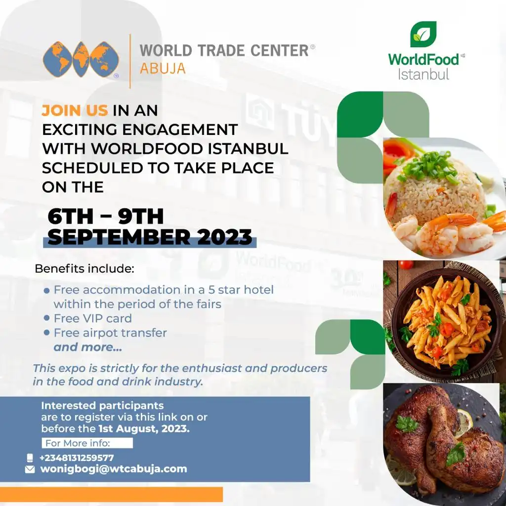Welcome To Past Events WORLD FOOD ISTANBUL HALAL EXPO NIGERIA 2023 GLOBAL EXPO INDIA 2023 53RD WTC’S ASSOCIATION GENERAL ASSEMBLY MAIDEN EDITION OF THE WORLD TRADE CENTER ABUJA WEBINAR SERIES Global Expo India 2022 International Trade Fair Load More